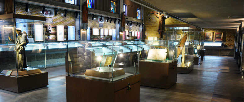 二十六聖人記念館はリニューアル工事に伴う展示工事のコンペでデザインが採用されました。展示品には、フランシスコ・ザビエルによる日本でのキリスト教布教から、弾圧の時代、二十六聖人の殉教、潜伏キリシタンから明治時代の信仰の復活まであり、 歴史的に重要な資料が数多くありました。 今回の仕事は、これら重要な資料を「守る」「見せる」展示をテーマに細部までこだわるデザイン・設計を行いました。 展示ケースは、基本的には気密性の高いケースをデザイン設計し、特に重要な展示品は、エアータイトケースという外気と遮断する密閉型の展示ケースをデザイン設計しています。また、展示品を見せるための地具も、展示物を傷つけず、 なおかつ来場者が見やすい構造の地具として、一つ一つ専用治具として設計しました。考えられる全てに対応した資料館となりました。