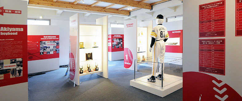 ソフトバンクホークスの元監督、秋山幸二氏の記念館を町内の文化施設内につくるプロポーザル企画・デザインをしました。プロポーサル参加社は私のお客様を含め4社、各社色々提案してきそうな会社ばかりです。その上製作予算はとても少ない状況でした。予算をかければ、それなりに良い提案もできるのですが、少ない予算で他社よりも良い提案を出さなくては勝てない仕事は、とても難しく疲れます。お客様と協議を重ね 精一杯の企画・デザインを提出!無事、お客様が受注しました。 秋山幸二は西武・ダイエー・ソフトバンクで活躍していたので、各球団カラーに偏らない様に野球ユニホームの基本色、白と情熱の赤でカラーイメージをまとめました。展示場内には各球団で活躍した当時のユニホームを 表裏見ることのできるスタンド展示ケースや等身大、秋山幸二マネキンの製作・秋山幸二の肉声で採点してくれるタッイパネル形式のクイズシステムなど、大人だけでなく、子供たちが楽しめるようにしました。 クイズ用の肉声録音のため、ご本人とあいましたが、とてもお茶目な人で素敵な人でした。