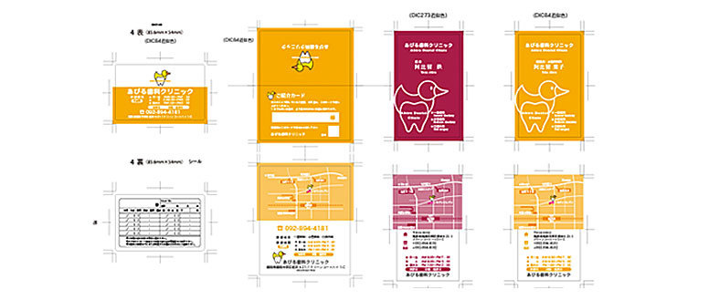 町の歯医者さんの診察券・名刺・ご紹介カードのデザインを制作しました。院長の名字が「あびる」から医院のキャラクターを「アヒル」に決定しました。安易な発想ですが、この医院には小児歯科があり、小さな子供が少しでも怖がらないようにしたいと言う、院長の優しさから生まれた発想です。かっこいいデザインではありませんが、気持ちをデザインした作品としてご紹介しました。